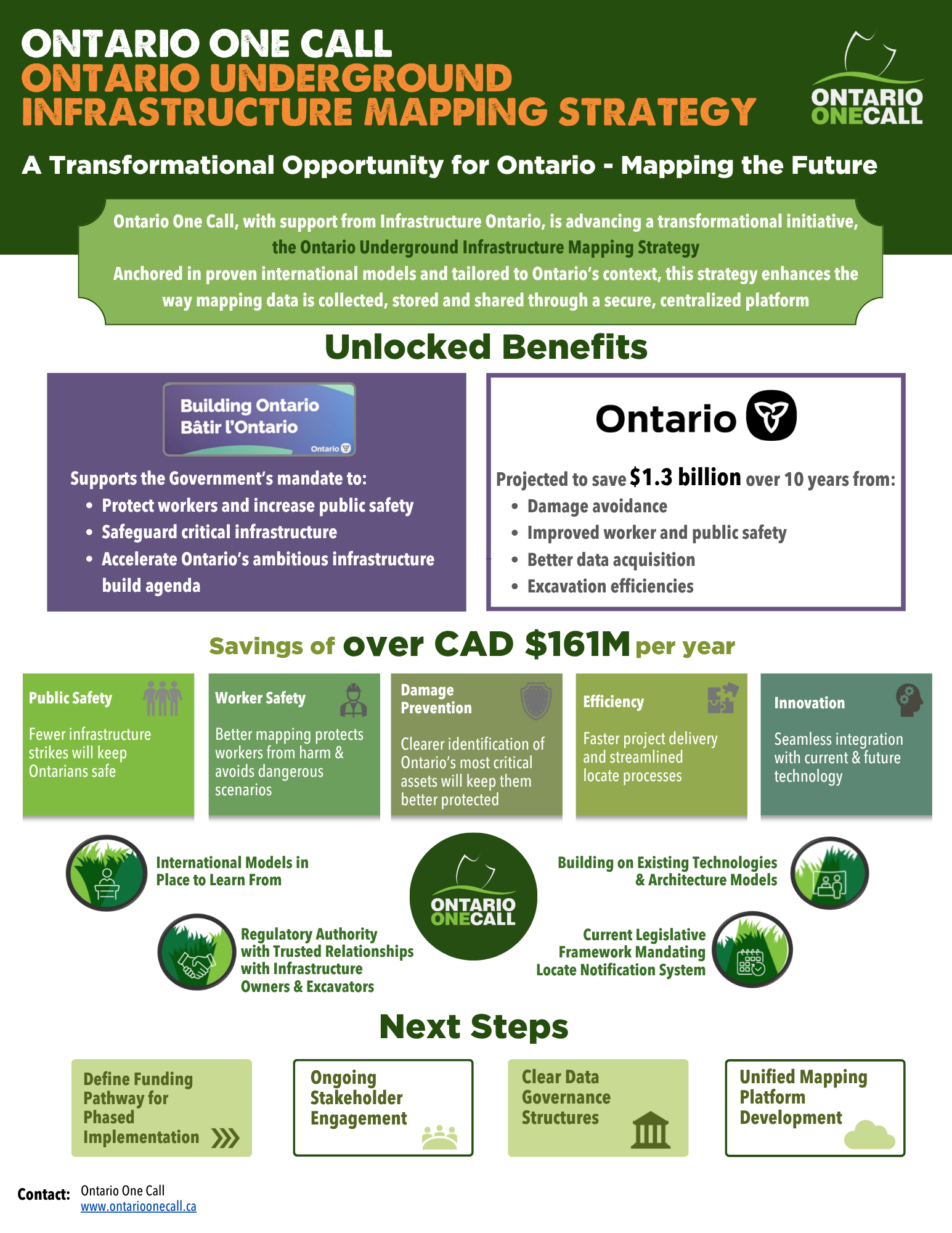 Ontario One Call, in partnership with Infrastructure Ontario, is proposing to advance a strategic initiative that will protect workers, safeguard critical infrastructure, and accelerate the province’s ambitious build agenda through the implementation of the Ontario Underground Infrastructure Mapping Strategy.